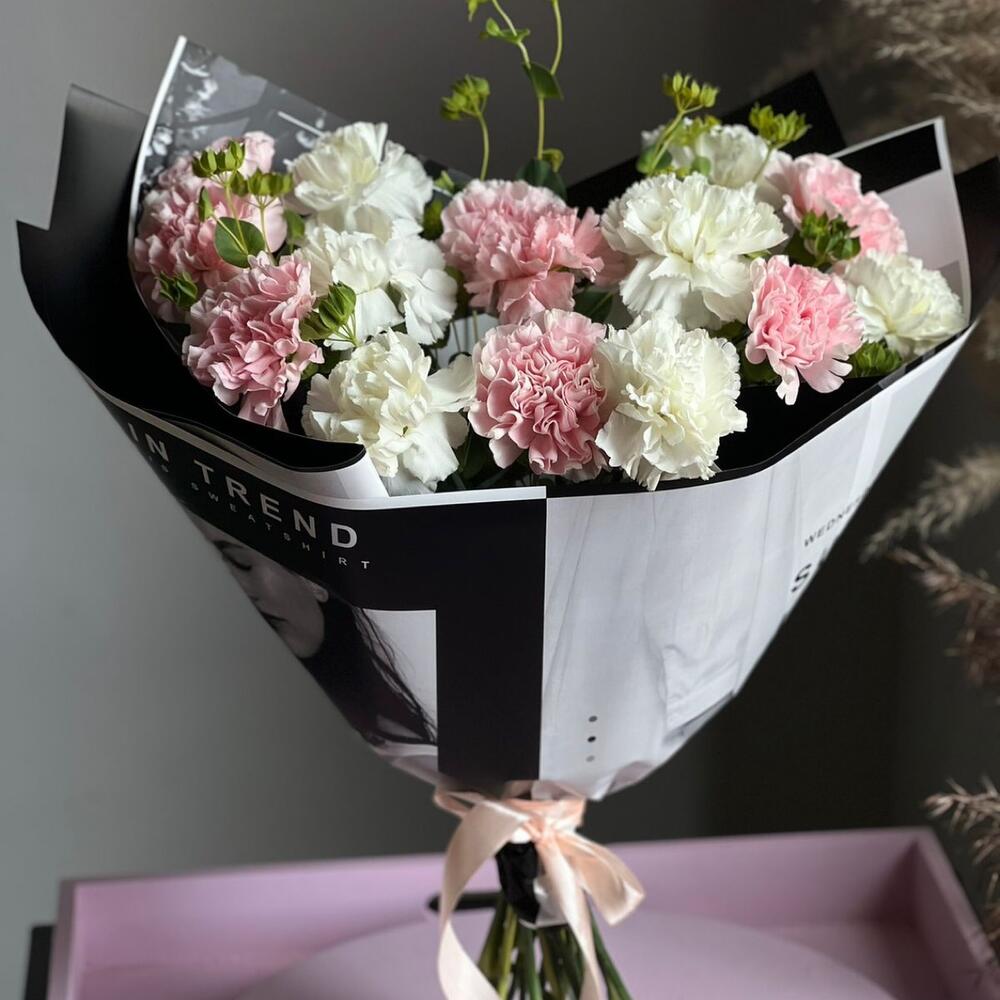 Гвоздика сортовая – 15 шт.Буплерум – 2 шт.Авторская упаковка – 1 шт.памятка по уходу – 1 шт.крафт конверт – 1 шт.