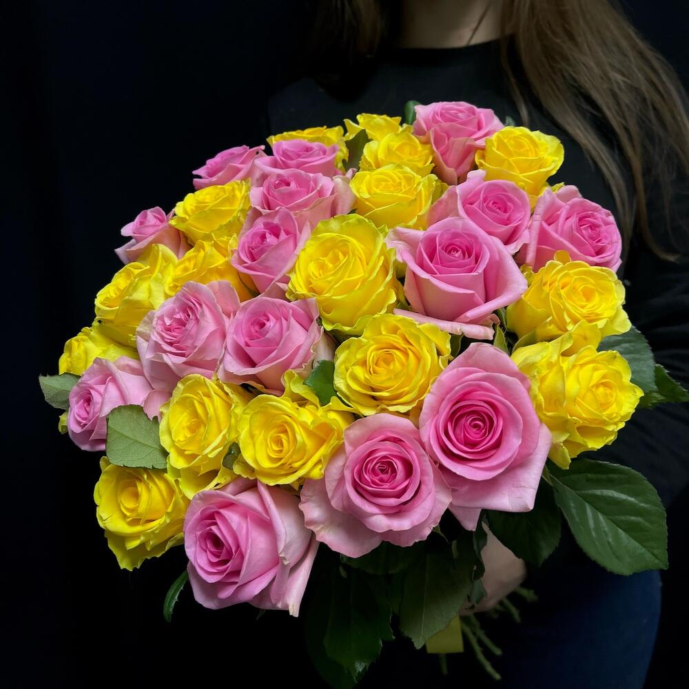 Розовая роза – 14 шт.Желтая роза – 16 шт.Лента атласная – 1 шт.