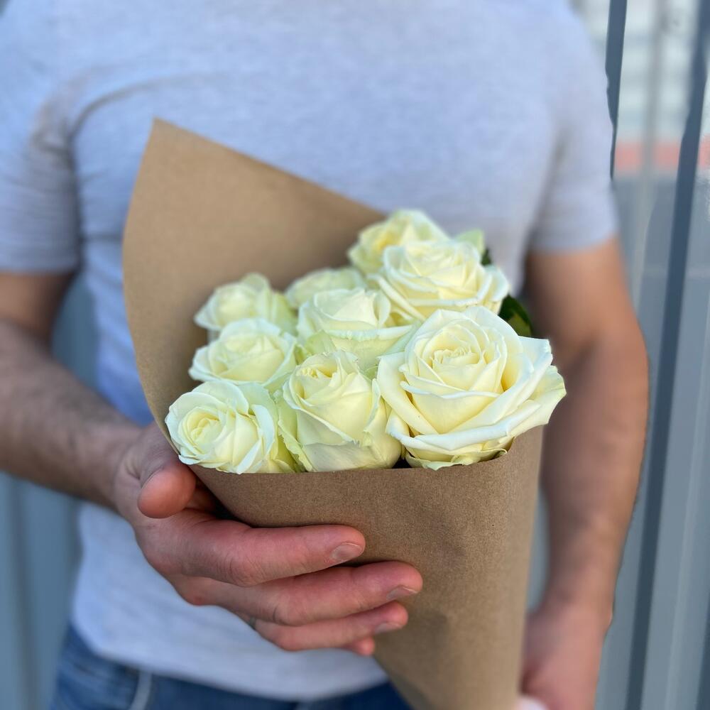 Лента атласная – 1 шт.Крафт – 1 шт.Роза белая 60 см – 9 шт.