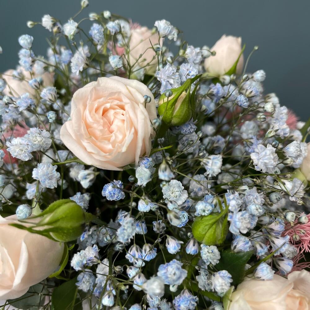 Цветочная композиция в шляпной коробке с голубой гипсофилой “Майолика”