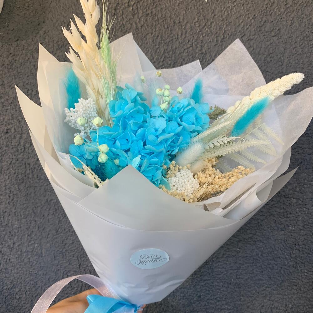 гортензия стабилизированная – 1 шт.Озотамнус – 2 шт.Колосья – 7 шт.Лагурус – 10 шт.папоротник стабилизированный – 1 шт.лен сухоцвет – 1 шт.Сетария – 1 шт.