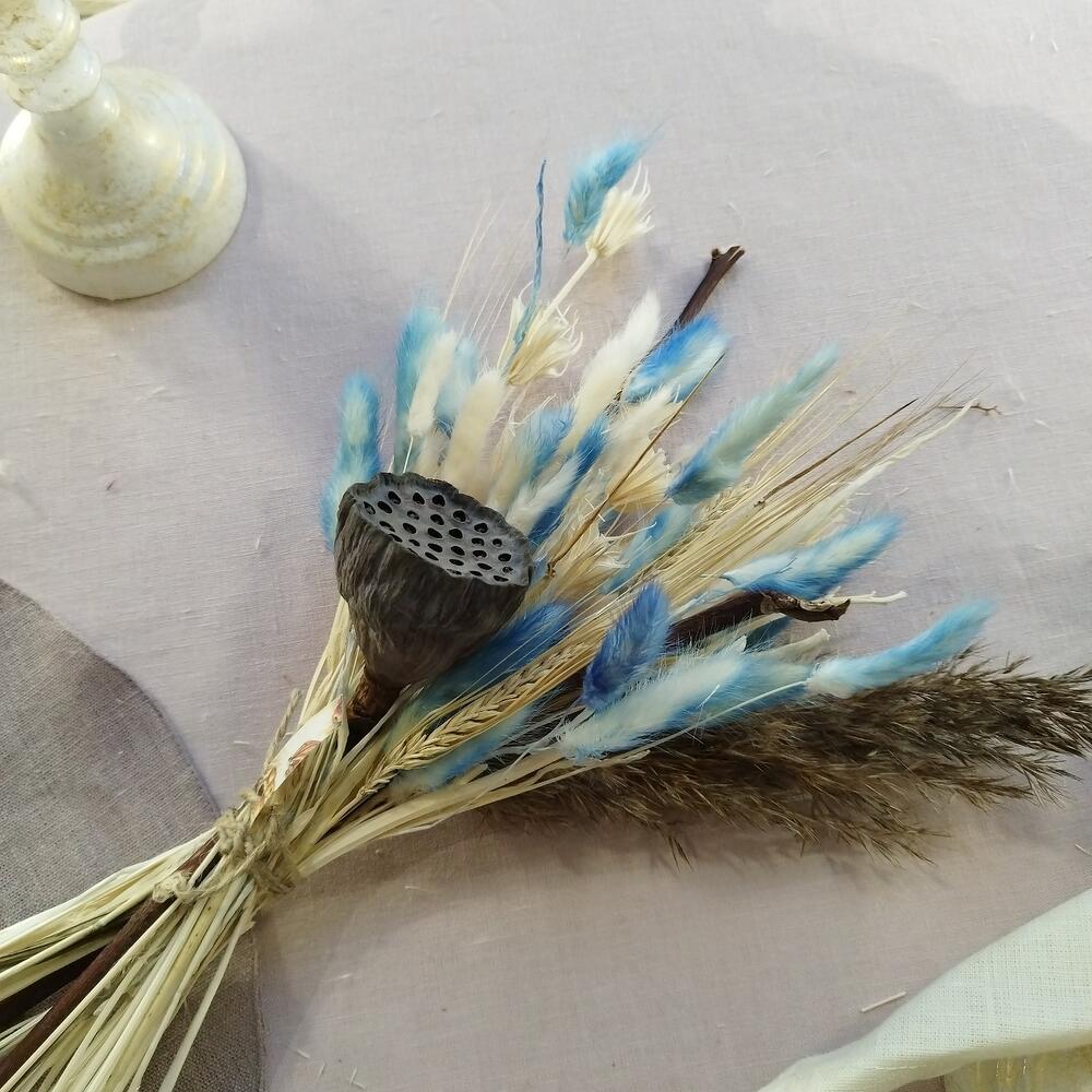 Лотос сухой – 1 шт.Лагурус (сухоцвет) – 30 шт.Нигелла сухоцвет – 2 шт.Колоски – 5 шт.камыш декоративный – 1 шт.