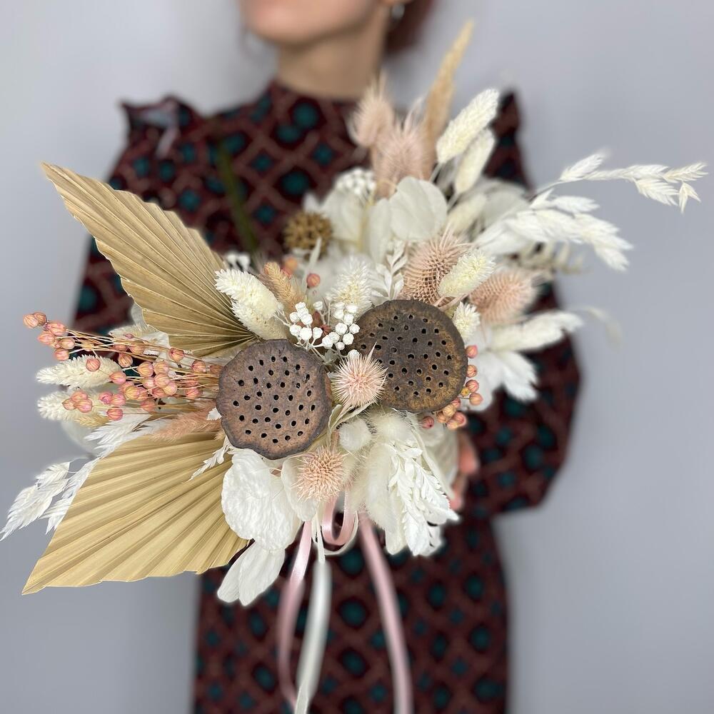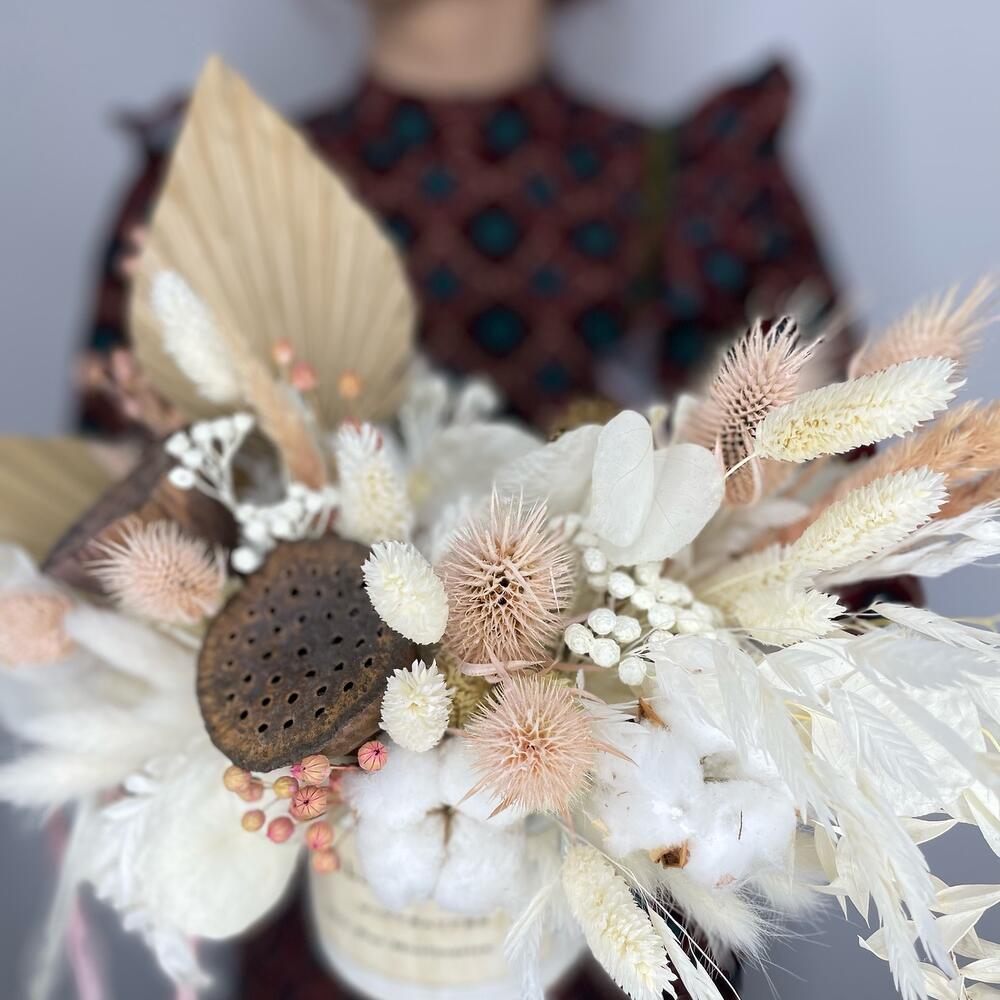 Композиция из сухоцветов и стабилизированных цветов в керамической лейке
